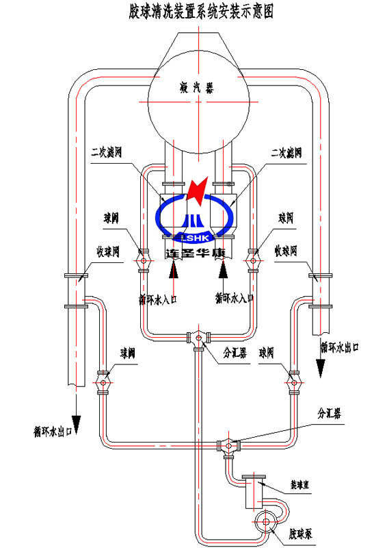 膠球清洗裝置是汽輪機組在運行當中對凝汽器冷卻管進行有效清洗的設備。該裝置使用性能的好壞直接影響到汽輪機凝汽器的清洗程度和傳熱效果。該裝置的適用范圍相當廣泛,它不僅適用于汽輪機凝汽器的清洗,同時適用于石油、石化、化工、鋼鐵單位;固定管板式熱交換器的冷卻管的清洗,近年來又進入了中央空調的市場,該裝置在連續工作不降低負荷的情況下,可以隨時投入使用,能始終保持冷卻管的清潔狀態,能延長冷卻管的使用壽命,減輕勞動強度,增加經濟效益。是提高電廠、石油、石化、化工、鋼鐵企業凝汽器及熱交換器安全經濟運行不可缺少的裝置。