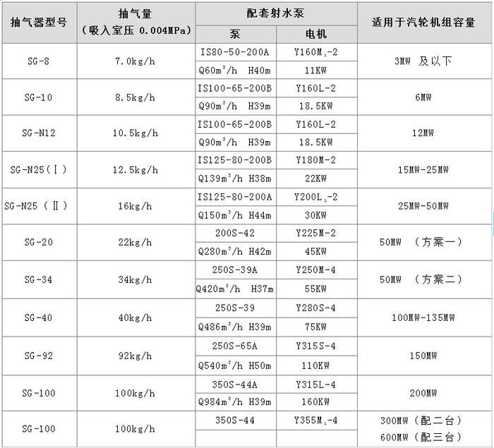 三、射水抽氣器的安裝及注意事項 1、抽氣器的兩種供水方式射水抽氣器的兩種供水方式可供選用。 (1)閉式循環 這是傳統的布置方式,將射水抽氣器置于射水箱之上,以射水泵—抽氣器—水箱循環供水,應投入一定量的補水,以控制夏季使用射水箱水溫。 (2)開式循環 “開式循環”就是射水泵進水來自循環進水管,而排水管則接入地場。其優點是: a、夏季可降低水溫4~8℃,將可提高真空7~15毫米貢柱; b、余速抽氣器投入后不會影響水溫; c、避免了因排出氣體的過壓縮而引起的功率損耗,其缺點是增加了循環水消耗量。 在向本廠訂貨前,先確定采用何種循環方式,也可委托本廠確定并代表擁護安裝設計。 2、進水參數的選擇 選用本系列低耗高效型射水抽氣器按規定選用水泵及點機,將獲得低耗高效之功效,射水抽氣器的進水參數(流量、壓力)對提高射抽內效率,降低耗功至關重要,這是因為在設計中工作水噴咀的口徑與水壓即決定了上述噴咀出口的流速。而流速又與噴射角、咀喉距、面積比及只喉長等因素有關,如采用水泵——抽氣器組合不當將影響使用效果。 3、射水抽氣器安裝中的注意事項 射水抽氣器的安裝質量與抽吸能力密切相關,主要應注意如下幾個方面: ①抽氣器安裝應豎直,各段在組合時應嚴格對中,支撐支架應穩固。 ②抽氣器安裝高度應適當,對采用閉式循環的抽氣器其余速接口高于水面1.5米以上。該低耗高效抽氣器,由于出口余速相對小一些,故出口埋入水的深度不宜過深,否則回導致在水壓偏低或夏季水溫升高時,影響抽吸能力,其出口管埋入深度為以250-300mm為宜。抽氣器的補充冷卻水應加至水泵進口處,以發揮其冷卻效果。 ③對開式循環射水抽氣器, 其出口管應盡量短, 彎頭最好不多于一只, 并采用大半徑彎頭, 起水平管段應向外傾斜, 其傾斜角>3/1000mm。管道插入循環水出水管內應接有向出水方向的彎頭一只,以利氣水混合物的排出。 ④對閉式循環的抽氣器,在夏季,其下置式的抽氣器不宜使用,射水箱的結構應有利于空氣的排出,上述措施均有助于水箱水溫的降低。 ⑤抽氣器本體安裝前應經1.5MPa 壓力的水壓試驗,五分鐘不漏。 ⑥當每機僅安裝一臺抽氣器時,空氣管道不必過高;當安裝兩臺抽氣器時,為避免水經備用抽氣器逆止閥返入凝氣器,其空氣連通管高度應≥11 米。 ⑦抽氣器空氣進管口口徑一般與凝氣器空氣出口管相同,長度應盡量縮短,以降低阻力;在管道上,除閥門及設備接口外,均不采用法蘭連接,以減少空氣漏入量。