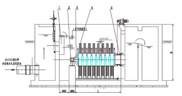 一、纖維轉(zhuǎn)盤濾池|纖維轉(zhuǎn)盤過(guò)濾器概述 纖維轉(zhuǎn)盤濾池|纖維轉(zhuǎn)盤過(guò)濾器是我公司自主研發(fā)的一項(xiàng)過(guò)濾技術(shù)。其主要原理是,當(dāng)污水進(jìn)入反應(yīng)槽后,轉(zhuǎn)盤交替地和空氣與污水相互接觸。在經(jīng)歷過(guò)一段時(shí)間后,在轉(zhuǎn)盤上即將附著一層棲息著大量生物的生物膜,微生物的種屬組成逐漸穩(wěn)定,其新陳代謝功能也逐步發(fā)揮出來(lái),并逐漸達(dá)到穩(wěn)定的程度,污水中的有機(jī)物為生物膜所吸附和降解。 二、纖維轉(zhuǎn)盤的過(guò)濾介質(zhì) 纖維轉(zhuǎn)盤濾池|纖維轉(zhuǎn)盤過(guò)濾器的過(guò)濾質(zhì)是纖維毛濾布,它的主要成分是有機(jī)纖維堆,其絨毛表面由50%超細(xì)聚酯纖維和50%改性丙烯晴纖維堆組成,同時(shí)以聚酯纖維作為支撐體。在干燥狀態(tài)下,纖維毛呈直立狀態(tài),浸濕后纖維毛便會(huì)耷拉下來(lái),形成濾布介質(zhì)有3-5mm的有效過(guò)濾深度,且當(dāng)量孔徑只有10μm ,可以使固體粒子在有效過(guò)濾厚度中與過(guò)濾介質(zhì)充分接觸,在反沖洗狀態(tài)下,與反抽裝置相靠近的纖維毛又會(huì)直立起來(lái),方便纖維毛中的雜質(zhì)排出,可以徹底清洗。纖維毛在各種狀態(tài)下的情況如圖所示: 三、纖維轉(zhuǎn)盤濾池|纖維轉(zhuǎn)盤過(guò)濾器的結(jié)構(gòu) 纖維轉(zhuǎn)盤濾池|纖維轉(zhuǎn)盤過(guò)濾器結(jié)構(gòu)如下圖所示,它由用于支撐濾布的垂直安裝于中央集水管的平行過(guò)濾轉(zhuǎn)盤串聯(lián)起來(lái)組成。一套裝置過(guò)濾轉(zhuǎn)盤數(shù)量-般為2-20個(gè) ,每個(gè)過(guò)濾轉(zhuǎn)盤是由6個(gè)小塊扇形組合而成。過(guò)濾轉(zhuǎn)盤由防腐材料組成, 每片過(guò)濾轉(zhuǎn)盤外包有纖維毛濾布。反沖洗裝置反抽吸裝置及閥門組成。排泥裝置由排泥管、排泥泵及閥門]組成,排泥泵與反洗水泵為同一泵。 四、纖維轉(zhuǎn)盤濾池|纖維轉(zhuǎn)盤過(guò)濾器的運(yùn)行 纖維轉(zhuǎn)盤濾池|纖維轉(zhuǎn)盤過(guò)濾器的運(yùn)行狀態(tài)包括:過(guò)濾、反沖洗、排泥狀態(tài)。 (1)過(guò)濾:外進(jìn)內(nèi)出,污水重力流進(jìn)入濾機(jī)體,使濾盤全部浸沒在污水中。同時(shí)為了使各處布水均勻并且使進(jìn)水量產(chǎn)生低擾動(dòng),須在濾機(jī)中設(shè)布水堰。污水通過(guò)濾布過(guò)濾,過(guò)濾液通過(guò)中空管收集后, 流入出水槽、堰排出濾機(jī)。整個(gè)運(yùn)行過(guò)程中過(guò)濾均為連續(xù)的,即便在清洗過(guò)程中,過(guò)濾仍在進(jìn)行。 (2)清洗:過(guò)濾中部分污泥吸附于纖維毛濾布中,逐漸成為污泥層。隨著濾布上污泥的積聚,濾布過(guò)濾阻力增加, 濾池水位逐漸升高。通過(guò)設(shè)置在濾池內(nèi)的液位傳感器監(jiān)測(cè)池內(nèi)的液位變化,當(dāng)該池內(nèi)液位到達(dá)清洗設(shè)定值時(shí)(高水位),控制盤即啟動(dòng)反沖洗泵,同時(shí)啟動(dòng)濾盤旋轉(zhuǎn),開始清洗過(guò)程。反洗時(shí)間和周期可以調(diào)整。 (3)排泥:纖維轉(zhuǎn)盤濾池|纖維轉(zhuǎn)盤過(guò)濾器轉(zhuǎn)盤下設(shè)有斗型池底,有利于池底污泥收集。池底污泥沉積減少了濾布上的污泥量,可延長(zhǎng)過(guò)濾時(shí)間,減少反沖洗水量。經(jīng)過(guò)一設(shè)定的時(shí)間段,控制盤啟動(dòng)排泥泵,通過(guò)池底穿孔排泥管、閥、泵將污泥排至污泥系統(tǒng)。其中,排泥間隔時(shí)間及排泥歷時(shí)可以調(diào)整。 五、纖維轉(zhuǎn)盤濾池|纖維轉(zhuǎn)盤過(guò)濾器的獨(dú)特設(shè)計(jì)和優(yōu)點(diǎn): (1)出水水質(zhì)好,耐沖擊負(fù)荷高; 纖維轉(zhuǎn)盤濾池|纖維轉(zhuǎn)盤過(guò)濾器截留效果好,在進(jìn)水SS不大于20mg/l時(shí),出水SS可以小于5mg/l。 (2)占地面積小; 與傳統(tǒng)的深層過(guò)濾單元不同的是:傳統(tǒng)過(guò)濾設(shè)備內(nèi)水流一般從上至下,或從下至上,屬于平面方向過(guò)濾,纖維轉(zhuǎn)盤過(guò)濾器則將過(guò)濾面豎直起來(lái),水流從左至右流動(dòng),因此很多過(guò)濾面可以并排布置,可以在保證過(guò)濾面積足夠大的前提下減少占地面積。另外,設(shè)備簡(jiǎn)單緊湊,附屬設(shè)備少,根據(jù)布置情況,附屬設(shè)備只需占用少量地方。 (3)設(shè)備閑置率低,總裝功率低; 所有濾盤幾乎總處于過(guò)濾狀態(tài),設(shè)備閑置率低。整個(gè)過(guò)濾裝置需要用電的只有驅(qū)動(dòng)電機(jī)、反洗水泵和電動(dòng)閥,驅(qū)動(dòng)電機(jī)功率僅為0.55KW-0.75KW,反洗水泵功率僅為2.2KW,總裝機(jī)功率很低 (4)反沖洗量水少,對(duì)前面處理工藝影響小; 纖維轉(zhuǎn)盤過(guò)濾器所需要的水量小,與處理水量的比為≤1%。實(shí)際工程運(yùn)行情況下,反沖洗間隔時(shí)間一般為2h,每個(gè)濾盤的沖洗時(shí)間為1-2mim。因此,反洗水量可以比較均勻地返回到處理前處理系統(tǒng),不會(huì)對(duì)前處理工藝產(chǎn)生影響。 (5)清洗徹底,無(wú)需預(yù)加氯; 濾布結(jié)構(gòu)為大孔隙支撐層及纖維毛層,反抽吸時(shí),在反抽吸口處纖維毛會(huì)完全直立起來(lái),清洗比較徹底,殘留很難積累。 (6 )運(yùn)行自動(dòng)化; 整個(gè)過(guò)程用計(jì)算機(jī)控制,可根據(jù)液位或時(shí)間來(lái)控制反沖洗過(guò)程及排泥過