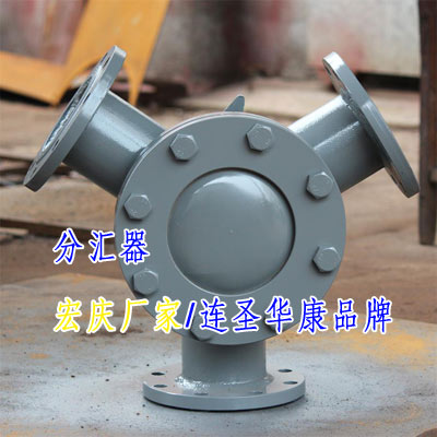 分匯器——膠球清系統分匯器 分匯器是一個三通閥,通過導向板的切換可使膠球進入需要清洗的一側凝汽器中工作。一般一臺機組需兩臺分匯器,其進口通徑為DN100,分配口為DN89,膠球投用時可通過窺視窗觀察運行情況。 發電廠凝汽器膠球自動清洗裝置系統組成:FH型分匯器(清潔海綿膠球切換三通管閥)。 分匯器可以將一根循環管分開成兩根獨立的管,比如在裝球器出口一根管路變到兩只噴球器的入口管路,那么分匯器可以很好的將此功能實現;同樣當把兩根再循環管合在一起成為一根再循環管時,比如兩個收球口的管路匯集到膠球泵的入口管路時,分匯器扮演了同樣的角色。
