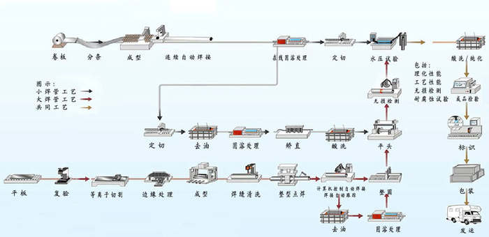 公司擁有國內先進制管流水線6條。從分條開卷、清洗脫脂、緄軋成型、焊接、打磨、定徑、在線固熔、渦流探傷、標志噴碼、定尺檢驗、氣密性試驗、檢驗包裝,都嚴格按照GB/T12771-2000《流體輸送用不銹鋼焊接鋼管》、ASTM A249/A249M-96a《鍋爐、過熱器、熱交換器及冷凝器用奧氏體焊接鋼管》、SA-249/SA-249M《鍋爐、過熱器、換熱器和冷凝器用焊接奧氏體鋼管子》執行。公司專業生產的管徑12mm-76mm,壁厚0.2mm-3.0mm的不銹鋼氬弧焊管,廣泛用于電力、化工、機械等行業;特別對電力行業的凝汽器改造用的高效不銹鋼管的生產、安裝有著豐富的經驗和能力。